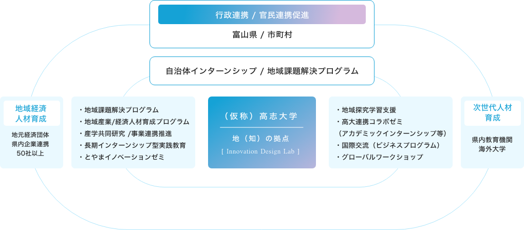 地域と大学が一体となった人材育成を体現するのが、独自の「(仮称)未来に向けたひとづくりプラットフォーム」です。(仮称)高志大学を「地(知)の拠点に」、企業・経済団体、行政機関と連携。